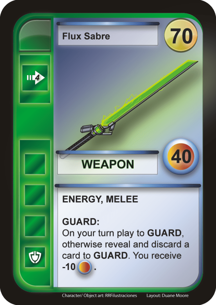 The other kind are energy powered flux weapons. In melee weapons the energy is focused to a deadly intensity that cuts through almost anything. The ranged weapons fire focused beams, blasts, or bursts of destructive energy.